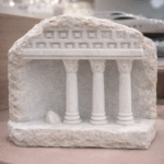 This sculpture draws inspiration from 4th-century BCE Attic naiskoi, particularly those found in Athens’ historic Kerameikos cemetery. The design features a three-column Ionic facade, a recessed niche, and a triangular pediment—core elements of Classical Greek temple architecture. The Ionic columns, with their slender proportions and volute capitals, symbolize grace, harmony, and intellectual refinement.