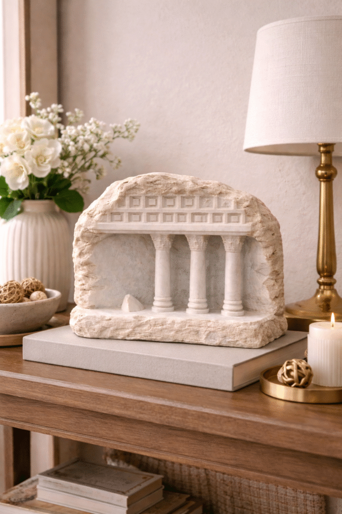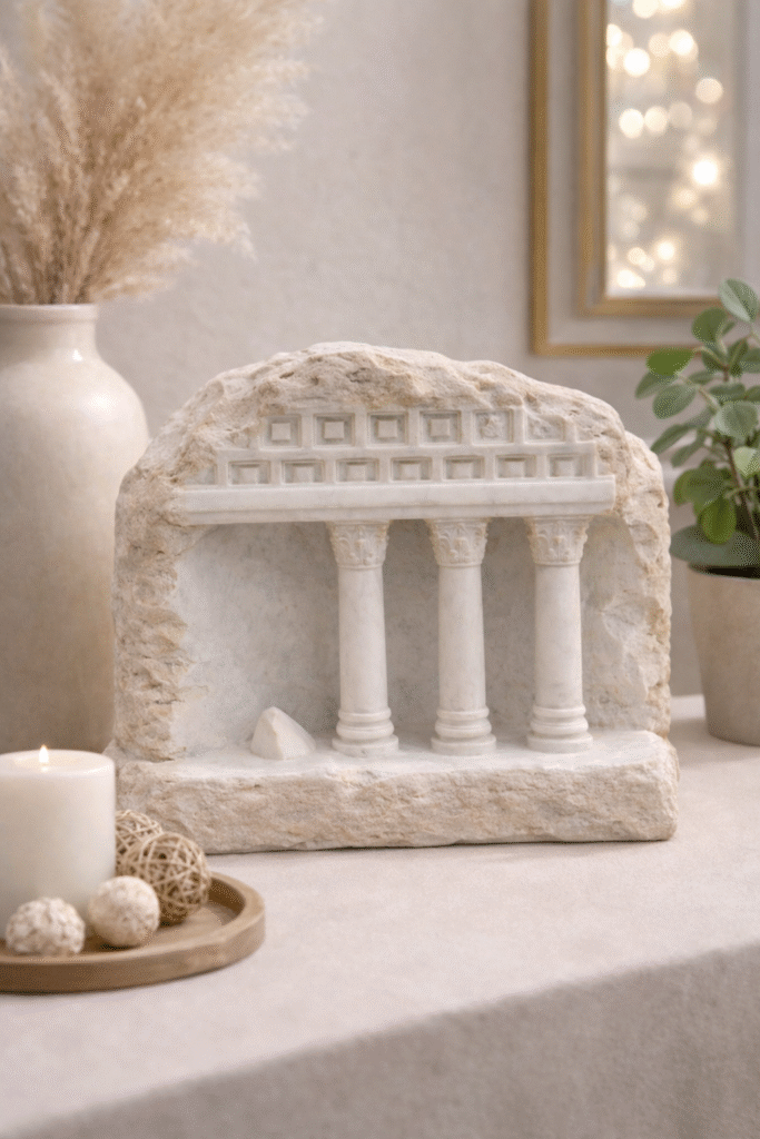 This miniature Greek temple facade complements classical, minimalist, Mediterranean, Japandi, and luxury contemporary interiors. Pair it with art books, neutral palettes, stone or wood textures, and warm accent lighting to create a curated, museum-inspired atmosphere.