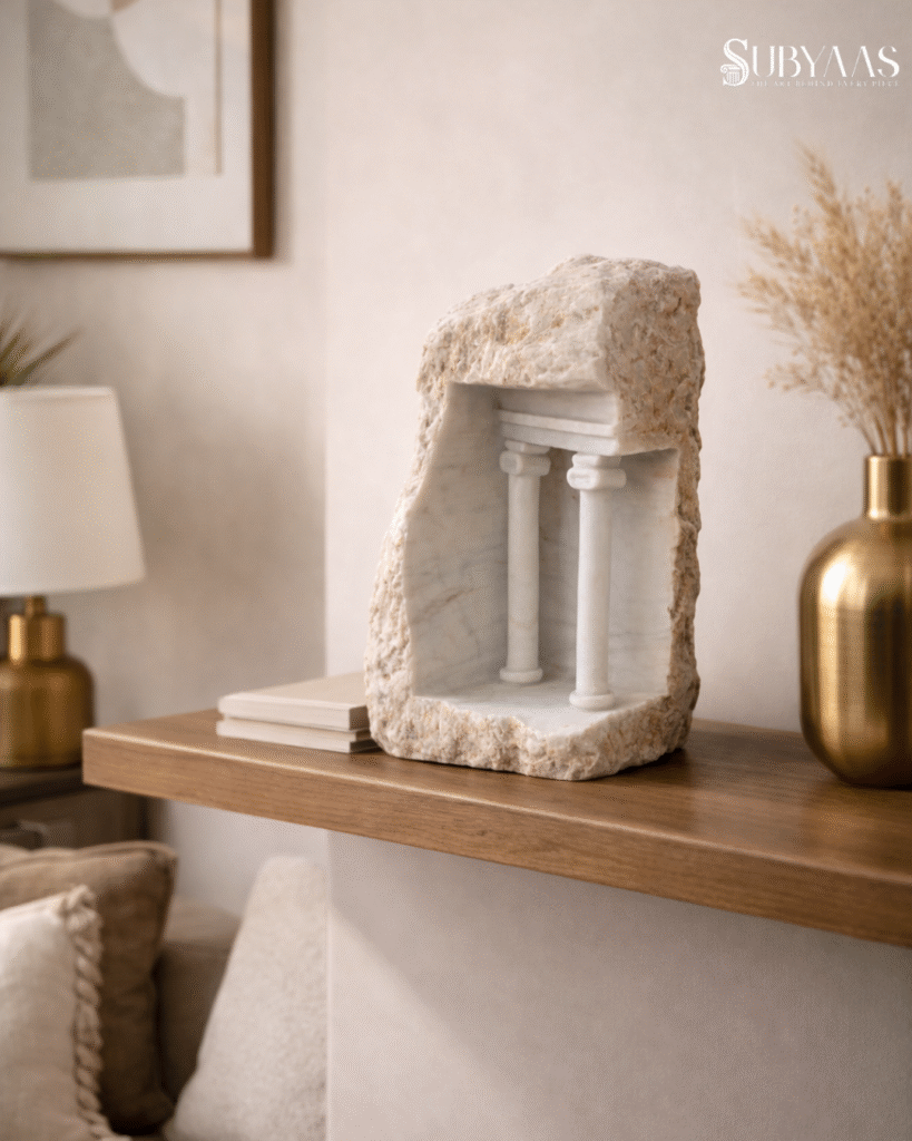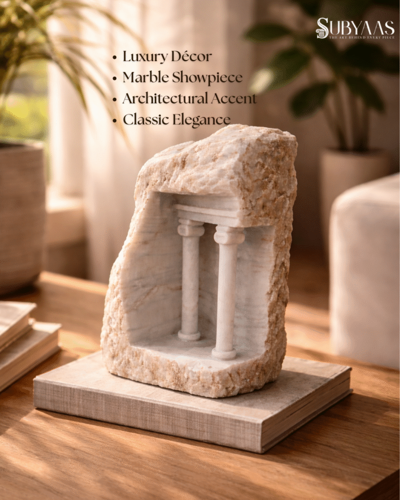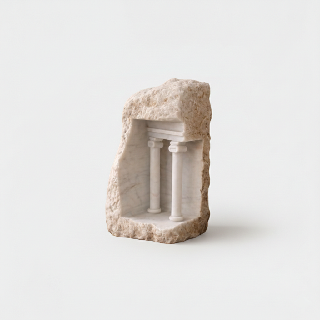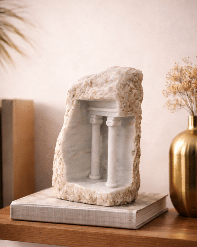 - Inspired by antique architectural fragments and the poetic minimalism of classical ruins, this Matthew Simmonds–Inspired Hand-Carved Marble Architectural Sculpture embodies stillness, proportion, and timeless craftsmanship.